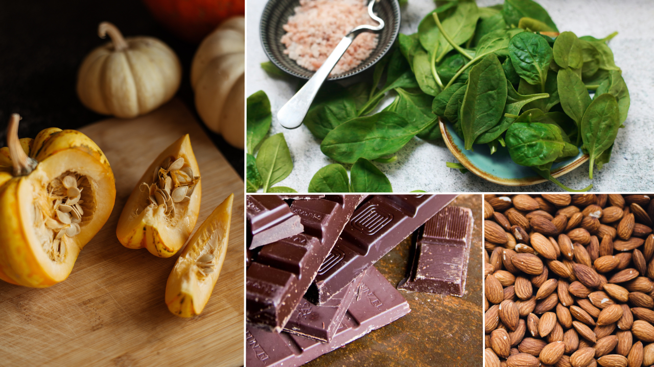 Sources: Dark chocolate, spinach, pumpkin seeds, and almonds.