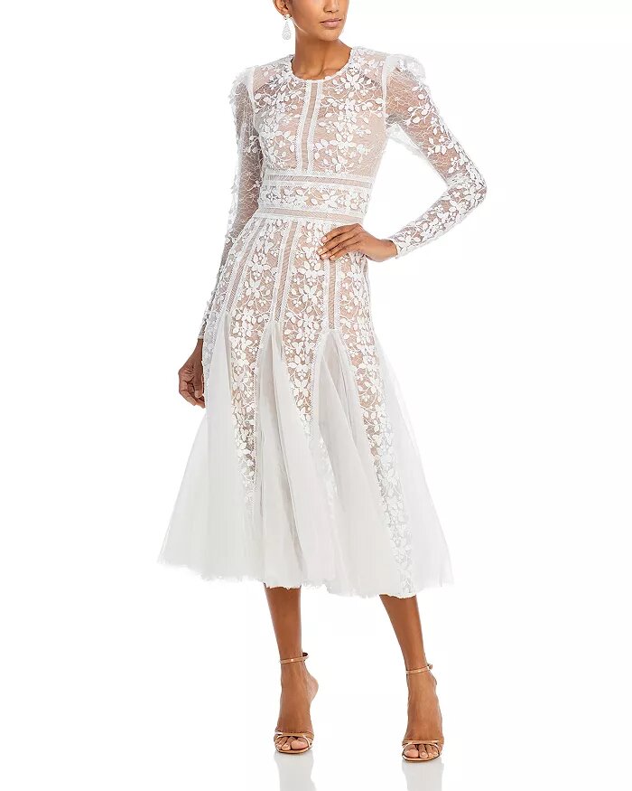 Megan Lace Midi Dress from Bronx and Banco, available for $1031 with shipping included. Elevate your wardrobe with this stunning addition, featuring a round neck and long puff sleeves that exude elegance and sophistication. The zipper closure at the back ensures a secure and comfortable fit. Intricate allover lace detailing and mesh inserts at the skirt add a touch of femininity and allure to this exquisite dress. Fully lined for added comfort and coverage, it promises to make you feel confident and stylish. Please note that this dress will arrive with a black B-tag attached, along with removal instructions. Kindly be aware that once the B-tag is removed, the dress becomes non-returnable. Imported for your convenience and style, it's a must-have for any special occasion.