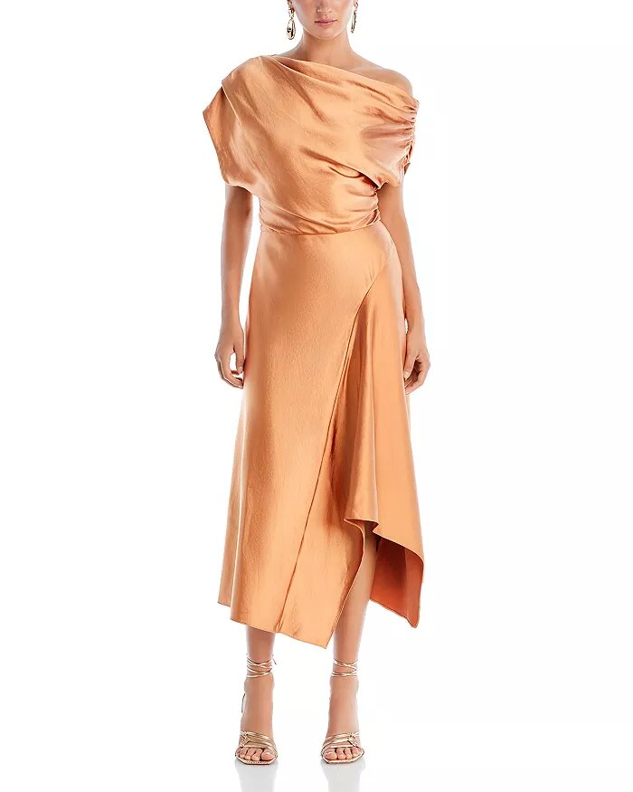 Jasmine Asymmetric Midi Dress, priced at $773 with shipping included. Elevate your wardrobe with this stylish piece that seamlessly blends fashion and comfort. Crafted to fit true to size, you can confidently order your regular size. This midi dress is designed to grace mid-calf length, presenting a refined silhouette with a length of approximately 48" from the high point shoulder to the hem, based on size 4. Our model, standing at 5'10" tall, wears a size 4 with measurements of 33.5" bust, 23.5" waist, and 34.5" hips, showcasing the elegance of this dress.