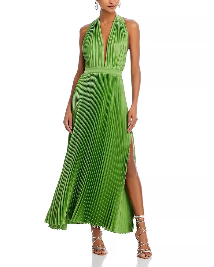 Presenting the L'IDEE Modernsite Pleated Gown, available for $627 with shipping included. This exquisite gown boasts a plunging V-neckline and sleeveless design, epitomizing modern elegance. Its wrap-around self-tie shoulder straps with a criss-cross back create a captivating silhouette. The fit-and-flare shape, complemented by an alluring left side slit, ensures a flattering fit. Adorned with allover pleating, this gown exudes sophistication and charm. Its open back and concealed back zip closure add a hint of allure and convenience.