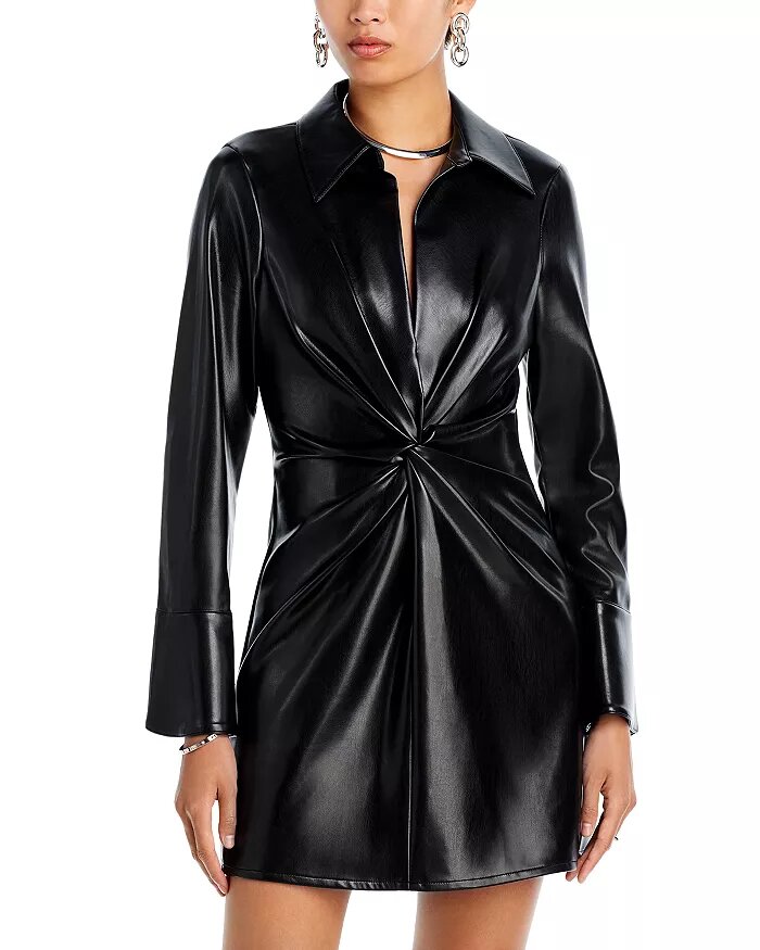 Mckenna Faux Leather Mini Dress, now available at up to 40% off. Originally priced at $579, you can now enjoy this amazing offer for just $347. This dress fits true to size, so simply order your normal size. It's fitted at the bust, waist, and hips, designed to hit above the knee, and crafted from slightly stretchy fabric for added comfort. The length from the highest point of the shoulder to the hem is approximately 34 inches, based on a size 4. For reference, our model stands at 5'10" tall, with a 33.5" bust, 23.5" waist, and 34.5" hips, and is wearing a size .