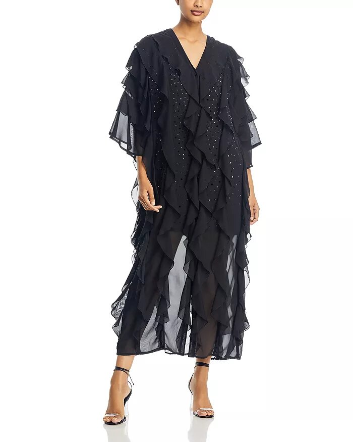 Misook Tiered Ruffle Woven Chiffon Maxi Dress, available for $1266 with shipping included. This captivating dress is a must-have addition to your wardrobe, featuring a flattering V-neckline and timeless button-front closures. Its voluminous tiered three-quarter length sleeves add drama and elegance, embellished with studs for a touch of sophistication. Adorned with layered chiffon ruffles, this dress exudes femininity and charm, making it perfect for special occasions. Fully lined for comfort and coverage, it ensures you feel confident and stylish all day long.