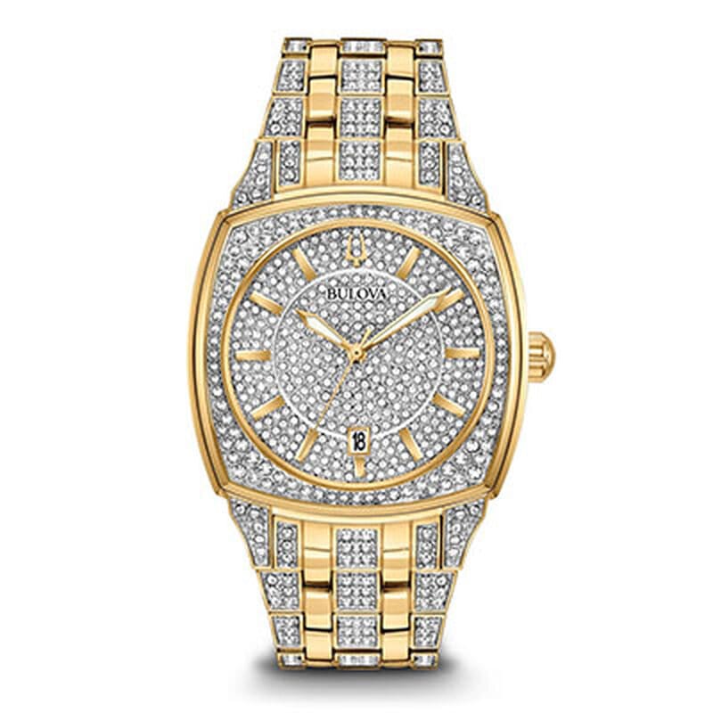 The Bulova Men's Phantom Crystal Watch 98B323 is an opulent dress watch, featuring 582 crystals adorning the cushion-shaped stainless steel and gold-tone case and bracelet. It boasts a round, silver-white dial with three hands and a date feature, all set in a pave design. The watch is equipped with a curved mineral crystal, a deployment closure, and quartz movement for precision. Additionally, it is water-resistant up to 30 meters. Enjoy up to 25% off this luxurious timepiece.