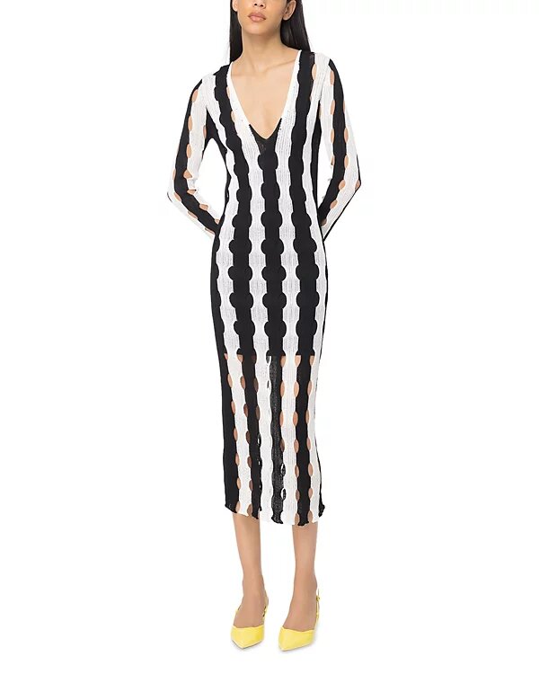 The PINKO Ring Openwork Cardigan Dress is now available at 50% off, with a price drop from $548 to $274. This stylish dress fits true to size, offering a flattering fit through the bust, waist, and hips. Designed to hit at mid-calf, it features a V-neck, long sleeves, and a pullover style. The intricate openwork design adds a unique touch, and the dress comes with a matching slip for added coverage. The model, standing 5'10" with measurements of 33.5" bust, 23.5" waist, and 34.5" hips, is wearing a size small. Take advantage of this amazing offer!