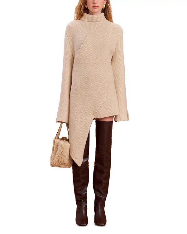 The Cult Gaia Cooke Asymmetric Dress, priced at $558 with shipping included, is designed to fit true to size and features a stylish mini-length, measuring approximately 38 inches. This dress showcases a chic turtleneck, long sleeves with trendy split cuffs, and a shift silhouette for a flattering fit. The ribbed fabric and pullover style make it a versatile and elegant option for various occasions.