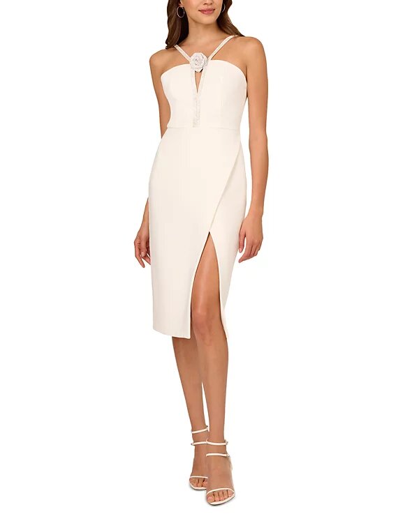 The Liv Foster Stretch Twill Midi Dress, now 25% off, offers a sleek and sophisticated design that fits true to size. Crafted with a stretch twill fabric, the dress is designed to hit just below the knees, with an approximate length of 44" from the back of the neck to the hem, based on a size 6. The halter neck features a chic cutout, and the dress is sleeveless, providing a modern and flattering midi silhouette. With a back zip closure for easy wear, this dress is both stylish and versatile, perfect for various occasions. Model is 5'10" with measurements 33.5" bust, 23.5" waist, and 34.5" hips, wearing a size 6.