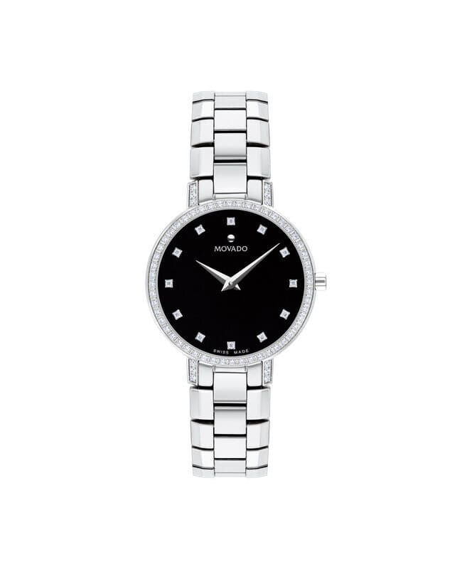 The Movado Ladies' Stainless Steel Faceto Watch, priced at $2,495 with shipping included, features a 28mm stainless steel case and bracelet accented by diamond-set lugs. Its sleek black dial is adorned with 12 diamond markers, while the bezel is also elegantly set with diamonds, adding a touch of luxury to this refined timepiece.