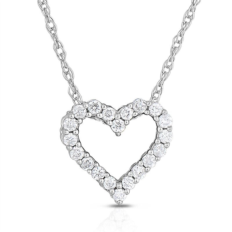 The Heart Diamond Pendant, crafted in 10k white gold, features a beautiful 1/10 carat total weight of diamonds. This elegant piece is adorned with 20 brilliant-cut round diamonds, intricately arranged in a heartfelt, sentimental design. Now available at 26% off, it's a timeless symbol of love and sophistication.
