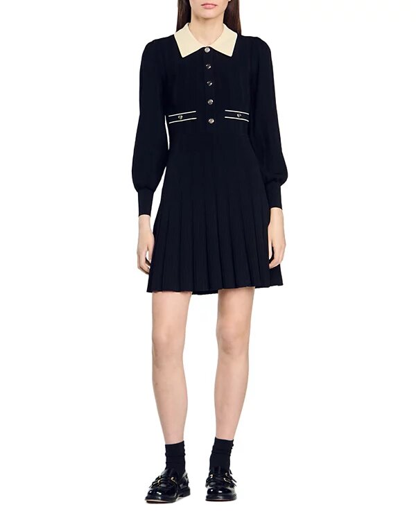 The Sandro Lison Short Knit Dress, priced at $395 with shipping included, offers a tailored fit at the bust and waist with a relaxed fit at the hips. Made from non-stretch fabric, it is designed to hit above the knee for a chic silhouette. The dress features a point collar, long puffed sleeves, and a front button placket, along with two faux flap pockets with button detailing. Its flared pleat skirt adds a playful touch, while the concealed zip closure ensures a seamless finish. It fits true to size, ensuring a flattering and stylish look.