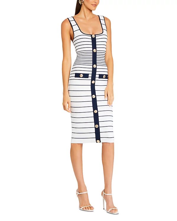 The Retrofete Lyle Knit Dress, priced at $378 with shipping included, features a chic square neckline and wide, sleeveless shoulder straps. A decorative button detail adorns the front, while a two-way zip closure at the back adds functionality. Designed to fit true to size, this figure-hugging dress offers a body-conscious fit with high-stretch fabric for comfort. It is designed to hit at the knee, measuring approximately 42.5 inches from the high point shoulder to hem in a size extra small. Perfect for a sleek, modern look.
