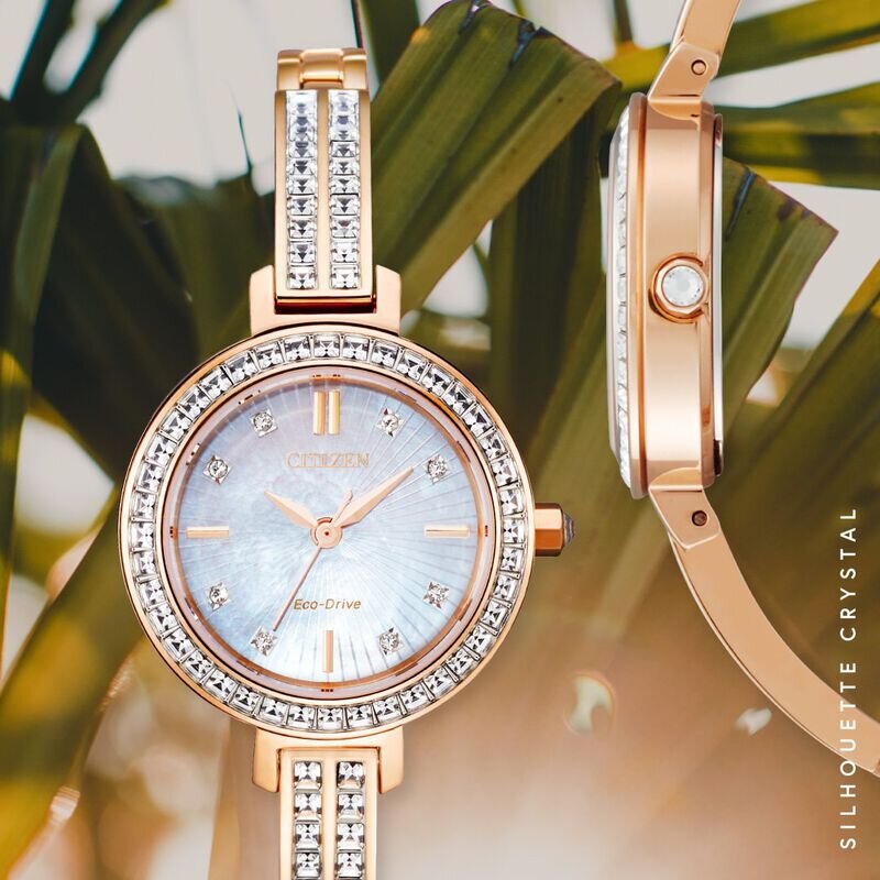 The Citizen Ladies' Silhouette Crystal Watch, now 25% off, is a stunning timepiece designed for the modern woman. It features a rose-gold-tone stainless steel bracelet adorned with princess-cut Swarovski crystals, and the 25mm case is also embellished with elegant Swarovski crystals. The mother-of-pearl dial is accented with crystals, and a single crystal on the crown adds a finishing touch of elegance. With its sleek bangle design, this watch can be worn alone or stacked with other bracelets for a personalized look.