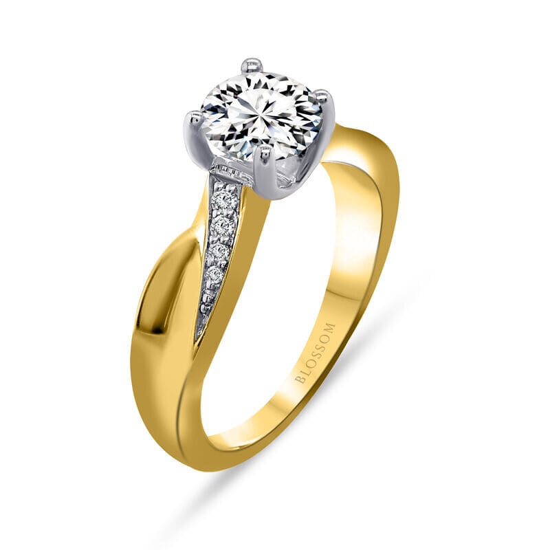 The Diamond Twist Wide Band Engagement Ring in 14k Yellow Gold, now 31% off, is part of the exclusive Blossom Cut lab-grown diamond collection at Rogers & Hollands | Ashcroft & Oak. This contemporary engagement ring features a radiant center lab-grown diamond, complemented by a curved row of sparkling lab-grown diamonds along each side of the wide 14k yellow gold band. The Blossom Cut, with its 104 expertly faceted diamonds, enhances the brilliance of the lab-grown diamonds, creating an extraordinary look for this stunning ring.