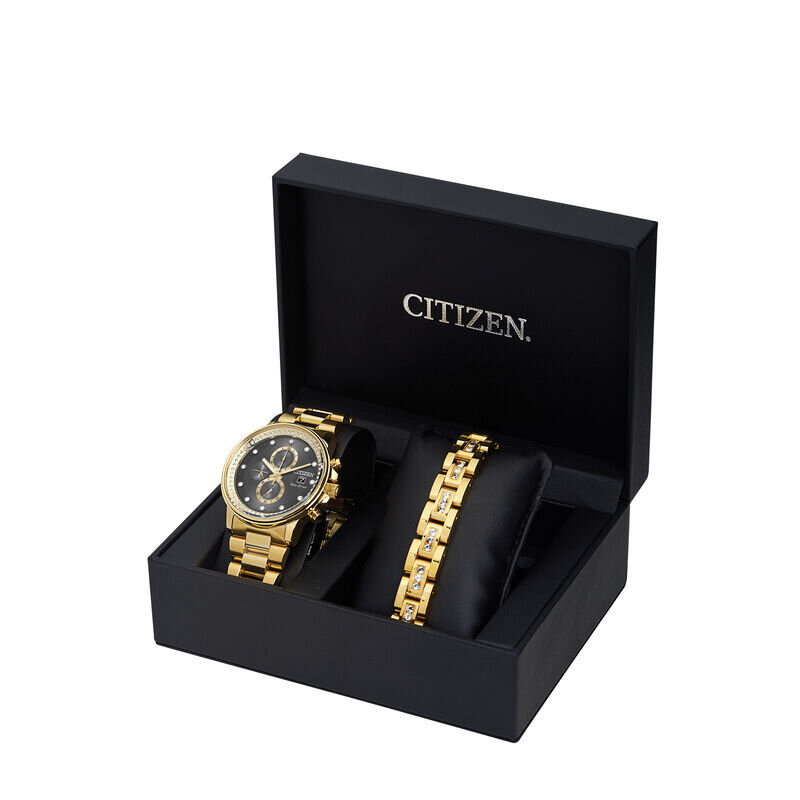 The Citizen Men's Nighthawk Watch Set, now 25% off, combines day-to-night style with sophisticated design. The 42mm yellow-gold-tone stainless steel case is surrounded by sparkling crystals, with additional crystal accents on the black dial and a matching yellow-gold-tone stainless steel bracelet. The chronograph subdials measure up to 60 minutes of elapsed time, 12/24-hour time, and 1/5 seconds. Water-resistant up to 200 meters, the watch is powered by Eco-Drive technology, eliminating the need for a battery.
