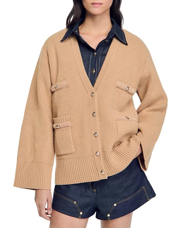 The Sandro Martie Flared Sleeve Cardigan, priced at $490 with shipping included, is a sophisticated piece crafted from 100% wool. It features a deep V-neckline and long, stylish flared sleeves. The cardigan is designed with front button closures, two patch pockets at the hips, and two welt pockets at the ribs, all accented by velvet braided trim for added elegance. The ribbed edges complete the refined look. This versatile cardigan can be hand washed or dry cleaned, ensuring easy care while maintaining its luxurious feel.