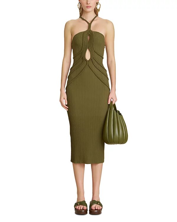 The Cult Gaia Avery Knit Dress, priced at $498 with shipping included, is designed to fit true to size and hits at the calves. Measuring approximately 47 inches from the high point shoulder to hem in a size small/4, this elegant dress features a halter neck and adjustable spaghetti straps for a customizable fit. It has a pullover style with intricate crochet detailing on the bodice and a stylish front cut-out. The model, standing 5'10" with measurements of 33" bust, 25" waist, and 35" hips, is wearing a size small/4.