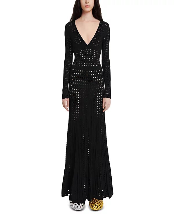 The A.W.A.K.E. MODE Perforated Knit Dress, priced at $760 with shipping included, is designed for a slim, floor-length silhouette. Measuring approximately 58 inches from the high point shoulder to hem in a size 38 FR (or 2 US), this dress offers an elegant, form-fitting look. Featuring a V-neck, long sleeves, and a striking low V-back, it has a distinctive open-knit design. The model, standing 5'10" with measurements of 33.5" bust, 23.5" waist, and 34.5" hips, is wearing a size 38 FR (2 US). Its pullover style makes it effortlessly chic and easy to wear.