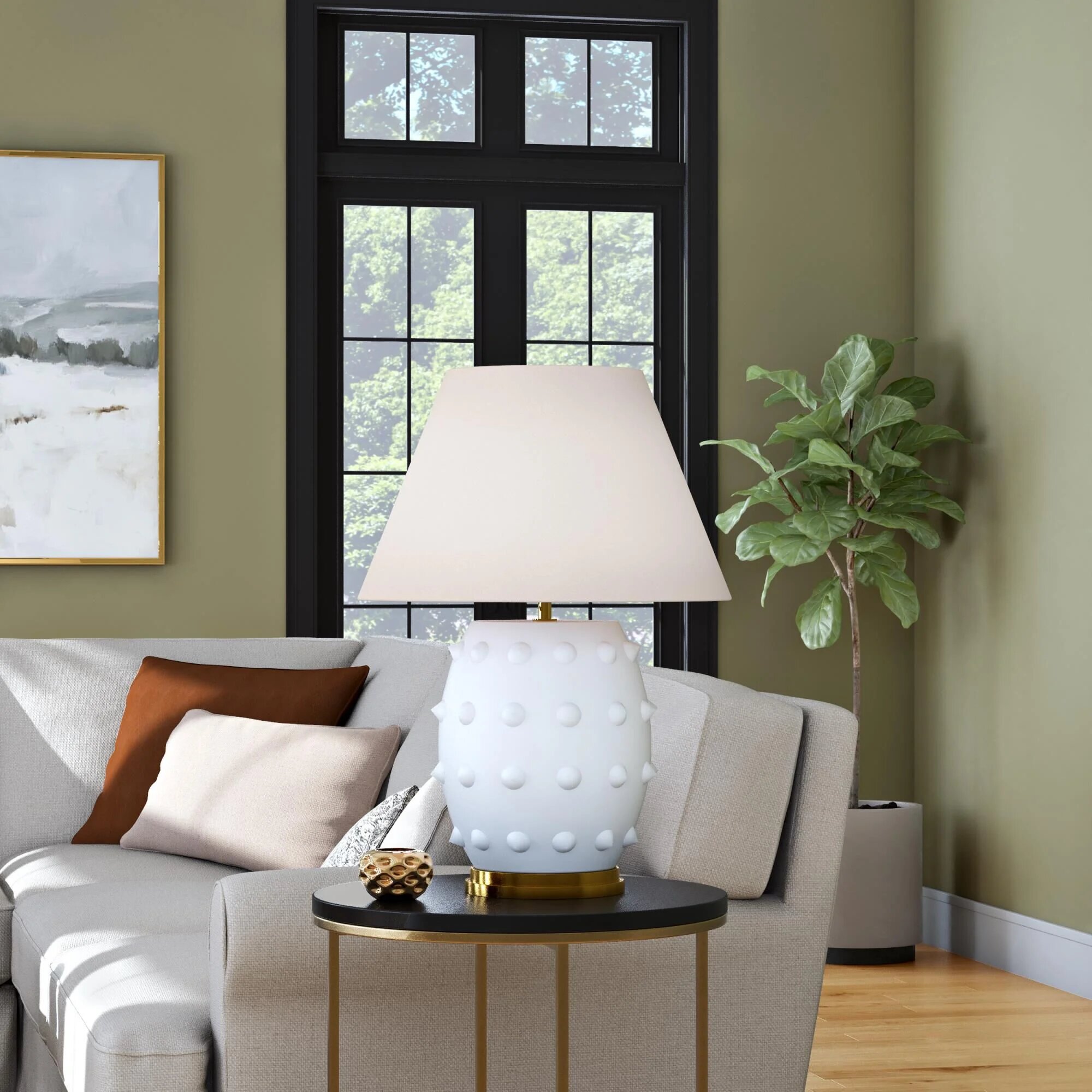 The Knobby 25-Inch Table Lamp by Allure Design Haus, priced at $525 with shipping included, effortlessly blends modern aesthetics with classic charm. Featuring a spherical base that adds a dimensional, sculptural look and elegant gold-tone accents, this lamp exudes luxury. Its pristine, tapered shade casts a soft, inviting glow, making it perfect for brightening a nightstand or adding a sophisticated touch to your living room. Available in two sizes, this chic lamp is designed to complement a variety of interior styles, making it a standout centerpiece in any room.