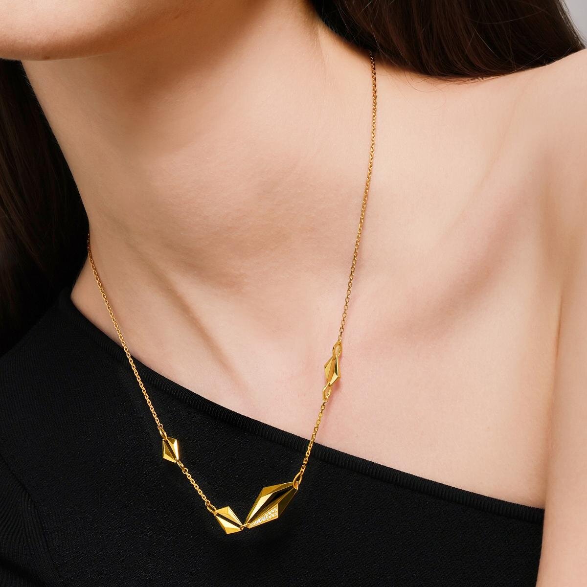 The 999 Gold Necklace, priced at $2,542 with shipping included, is a stunning piece from the M Collection, showcasing its signature geometric design. Crafted with approximately 0.321 taels of 999 gold, this necklace features an elegant arrangement of various-sized shapes, each set with shimmering diamonds. The adjustable length, ranging from 42 to 47 cm, makes it a versatile accessory suitable for any occasion. This multifaceted design embodies sophisticated elegance, making it a standout addition to any jewelry collection.