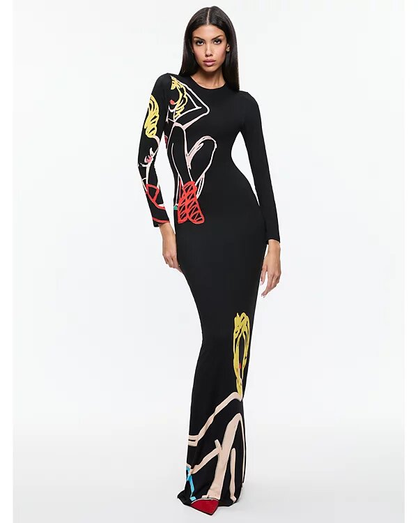 The Alice and Olivia Delora Open Back Maxi Dress, priced at $595 with shipping included, is a stunning piece designed for a floor-length look. It features a round neck, long sleeves, and an elegant open back cutout, with a zipper at the center back waist for a sleek fit. Measuring approximately 60 inches from the back of the neck to the hem (based on size 4), this dress fits true to size, so you can order your usual size with confidence. The model is 5'10" with measurements of 33.5" bust, 23.5" waist, and 34.5" hips, wearing a size 4.