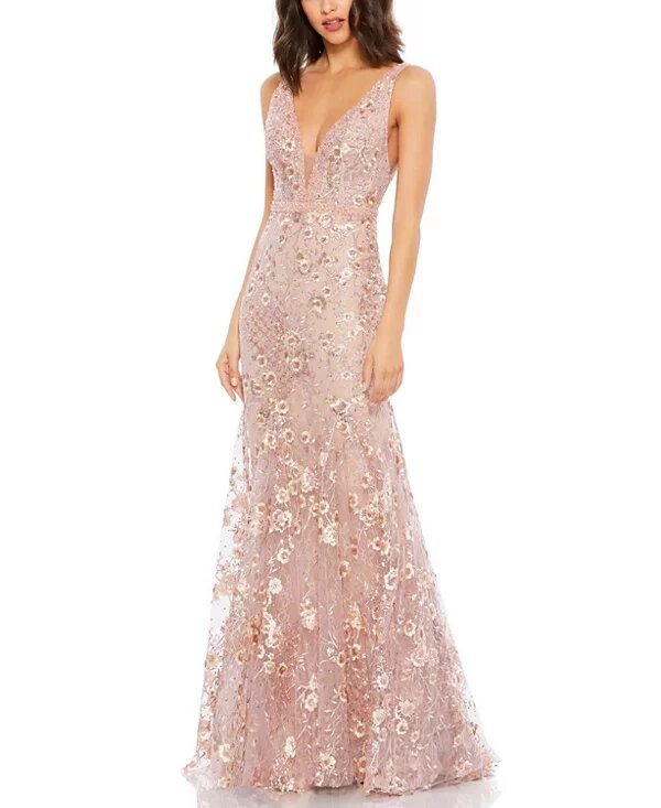 The Floral Embellished Sleeveless Plunge Neck Gown is now 25% off. This gown fits true to size and is designed to be fitted at the bust, waist, and hips. It is made from non-stretch fabric and measures approximately 62.5" from the top of the shoulder to the bottom hem, giving it a floor-length look. The model, standing at 5'9" and wearing a size 2, showcases the gown's elegant plunge neckline and beaded waist detailing. It features a back zipper closure and is fully lined for added comfort and structure.