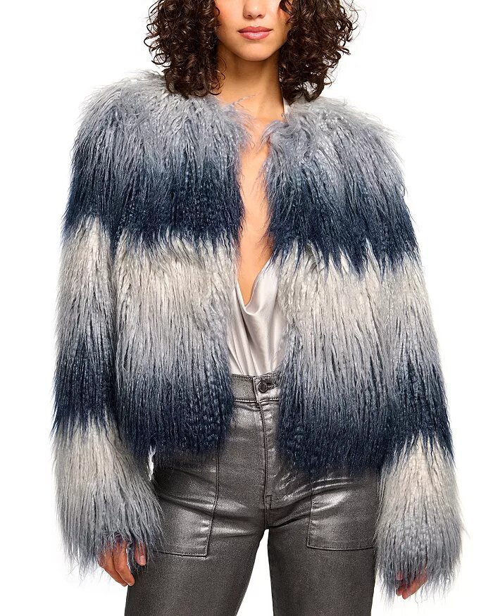 The Ramy Brook Samuel Faux Fur Jacket, priced at $495 with shipping included, offers a luxurious and relaxed fit, designed to hit at the hip. True to size, this jacket is modeled by a 5'10" individual with a 33.5" bust, 23.5" waist, and 34.5" hips, wearing a size small. It features a stylish crewneck, long sleeves, and a front hook-and-eye closure. The dip-dyed faux fur adds a modern, chic touch to this versatile piece, making it both cozy and fashionable for various occasions.