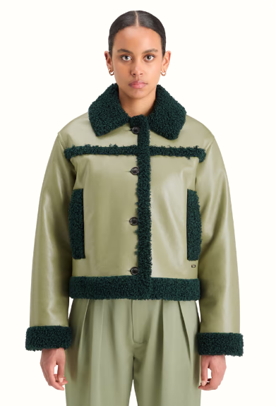 The Shearling Vinyl Aviator Jacket is now available with up to 15% off. This stylish piece adds an edgy touch to your wardrobe, perfect for giving your nights out some shine or adding a bold twist to your daytime look. Featuring a high-gloss finish and a classic aviator cut, this jacket is designed to stand out. Made from 100% polyester, it is imported and should not be washed to maintain its quality.