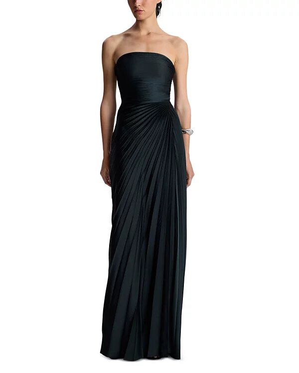 The A.L.C. Bianca Dress is available for $695 with free shipping. This elegant dress fits true to size and is designed to be fitted at the bust, waist, and hips. Crafted from non-stretch fabric, it is intended for a floor-length look with a length of approximately 58.75" based on a size 4. The dress features a strapless neckline, sleeveless design, and a concealed side zip closure. The allover pleating adds a refined, textured detail, making it a stylish and sophisticated choice for special occasions.