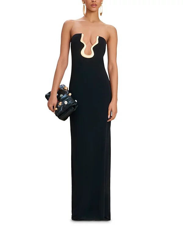 The Cult Gaia Abril Evening Gown is available for $1,198 with free shipping. This stunning gown features a plunging, notched neckline with gold-tone metallic edging, adding an elegant touch to the strapless silhouette. Designed with a classic gown shape, it has a concealed side zipper closure for a sleek and secure fit. Please note, the dress comes with a black b-tag attached, and once the tag is removed, it cannot be returned, ensuring the product’s authenticity and condition.