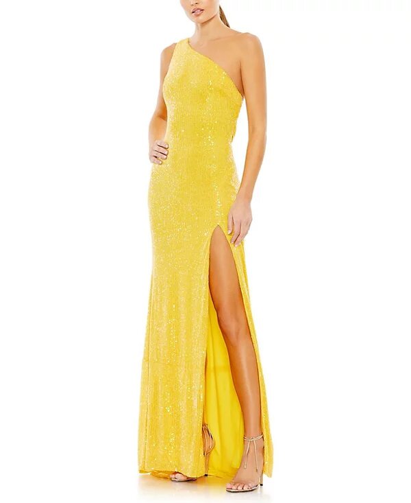 The Mac Duggal Sequined One Shoulder Draped Back Gown is available for $398 with free shipping. This stunning gown features a one-shoulder design with a single sleeve and a concealed side zipper for a sleek fit. It is designed for a floor-length look, measuring approximately 62.5" from the top of the shoulder to the hem. The gown is fully lined and includes a draped open cowl back for a dramatic, elegant touch. Fitted at the bust, waist, and hip, the gown is made from high-stretch fabric, ensuring a comfortable yet form-flattering fit. The model is 5'9" and wears a size 2.