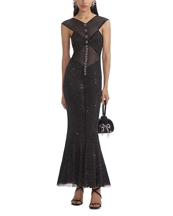 The Self-Portrait Embellished Fishnet Gown is available for $700 with free shipping. This gown fits true to size and is designed with a flattering, fitted silhouette at the bust, waist, and hips. The moderately stretchy fabric ensures a comfortable fit, while the gown is designed to hit below the ankle with an approximate length of 55". The sleeveless gown features a V-neckline, semi-sheer and opaque paneled design, and front decorative jeweled buttons. The all-over rhinestone-embellished fishnet texture adds a touch of glamour, and the flared skirt completes the elegant look.