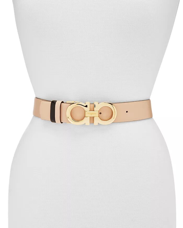Women's Adjustable & Reversible Gancini Belt, a versatile accessory that effortlessly combines style and functionality. With a width of 1.25", this belt features a signature double Gancini buckle adorned with an engraved logo, adding a touch of elegance to your ensemble. Designed with versatility in mind, the belt showcases a reversible black/bisque color scheme, allowing you to easily switch up your look. The adjustable feature ensures a customized fit, and the belt can be conveniently cut to size for a perfect match to your preferences. Crafted from premium leather, this Gancini Belt is a testament to Italian craftsmanship, providing a blend of durability and sophistication. Elevate your fashion statement with this exquisite accessory, proudly made in Italy.