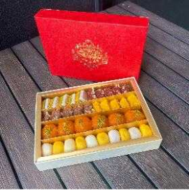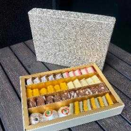 Pack Includes: Approx 2.5 Lbs assorted pack of Melon Ball, Sangam Burfi, Dhoda Burfi, Kaju Pista Roll, Anjeer Roll, Kesar Paan Roll.
