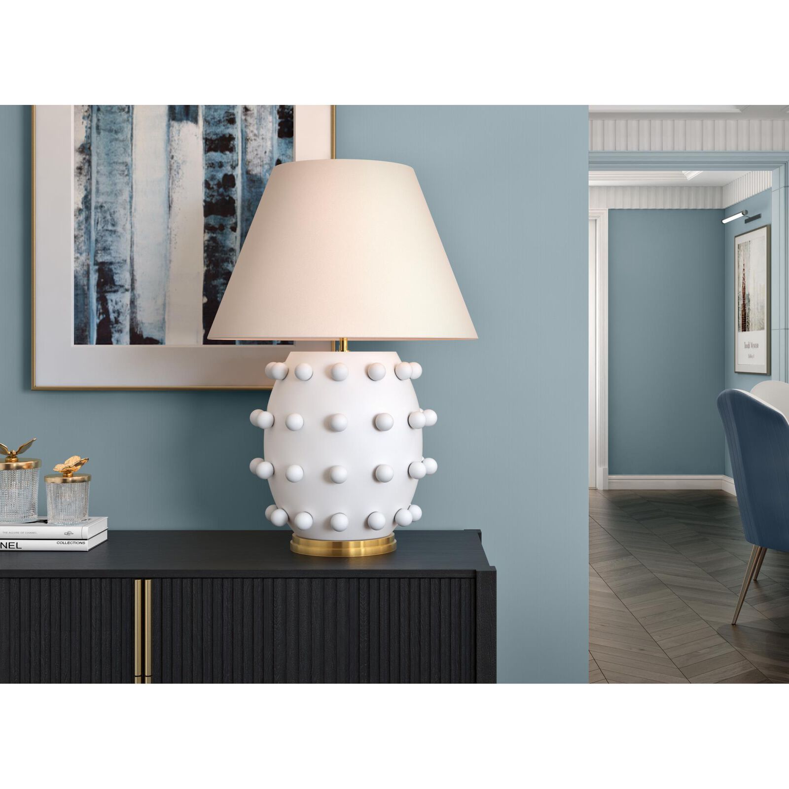 Knobby 32-inch Table Lamp by Allure Design Haus - $739. This chic table lamp combines modern aesthetics with classic warmth, making it perfect for illuminating your nightstand or adding elegance to your living room. The spherical base offers a dimensional look, while the gold-tone accents add a touch of luxury. Topped with a pristine, tapered shade, the lamp casts a gentle glow, creating an inviting ambiance in any space. Available in two sizes, this sophisticated lamp is designed to complement a wide range of interior styles, making it the centerpiece of your room's lighting ensemble.