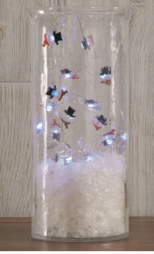 Plastic and wire. 20 LED lights string with top hat snowmen. Four hour auto-on timer. Requires three AA batteries, not included.