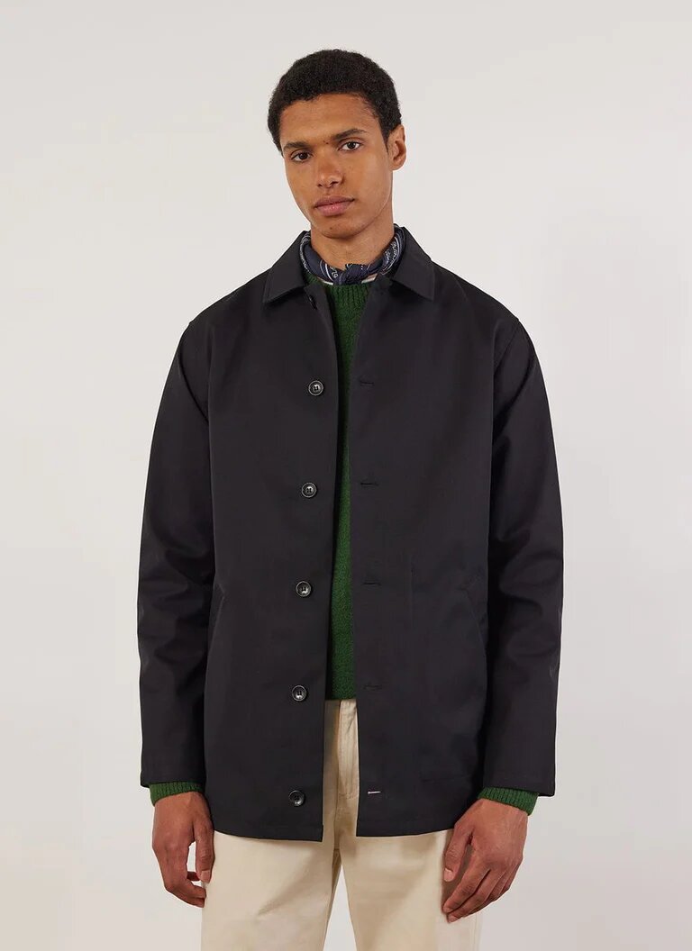 Waterproof Auxiliary Sherlock trench coat, available for $525 with complimentary shipping. This short trench coat is crafted from water-resistant fabric, ensuring durability and breathability. It features two welt pockets and spacious internal pockets for added convenience. Made from a high-quality waterproof Italian cotton blend, this coat comes in a sophisticated black with blue accents. Designed for a regular fit, it is expertly crafted in Portugal and designed in London, combining style and functionality seamlessly.