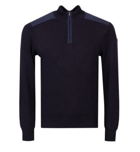 Men's Blue Shoulder Detail Cotton Half Zip, available for $375 with complimentary shipping included. Elevate your wardrobe with the Paul & Shark Shoulder Detail Cotton Half Zip in Navy. This garment seamlessly blends the renowned luxury of the Paul & Shark brand with a minimalist half-zip sweatshirt design, ideal for layering during the upcoming season. Crafted with a convenient half-zip closure, it showcases stylish shoulder panel detailing, accentuated by embroidered branding on the upper left sleeve. Experience sophistication and comfort in one with this versatile piece.