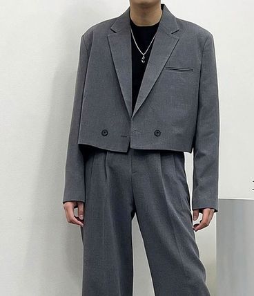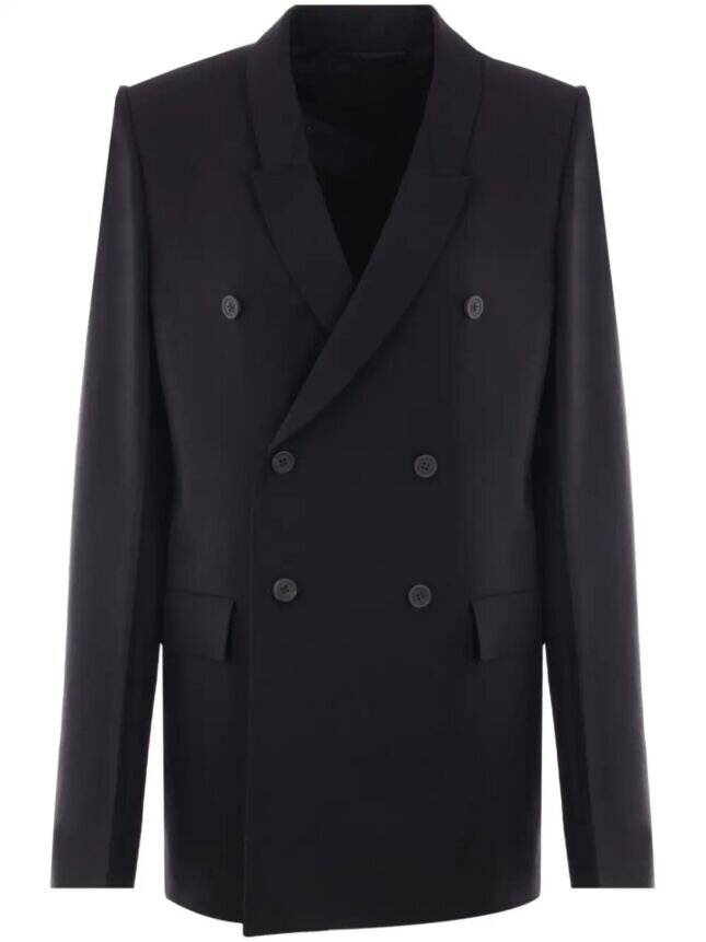The RICK OWENS Grain De Poudre Jacket is available for $2168 shipped. This hip-length jacket features sharp shoulders, a slim lapel, and a double-breasted front with four buttons. It includes a welt breast pocket, side pockets with flaps, two side back vents, and five-button cuffs. The jacket is fully lined and has internal buttoned pockets. Made from 100% new wool, it is crafted in Italy. The model is wearing a size 40.