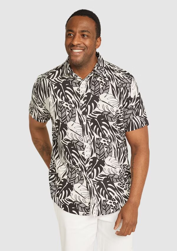 Black Gus Tropical Shirt, now available at a discounted price of up to 44% off, reduced from $90 to $50. Embrace laid-back island vibes with the Gus Tropical Shirt by Johnny Big, perfect for your next BBQ or casual outing. Crafted from a deluxe textured cotton blend, this shirt offers both comfort and style with its regular fit. It features a button-through design and a playful tropical print that adds a touch of fun to your ensemble. Whether paired with denim shorts or your favorite jeans, this men's shirt is sure to elevate your look.
