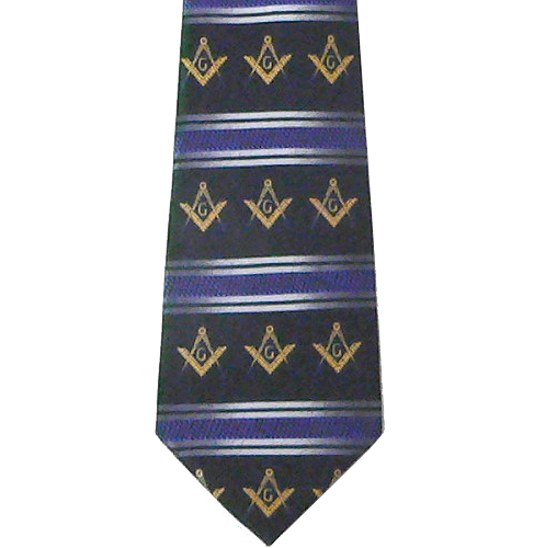 Men's Masonic Masonic neck tie a symmetrical pattern with black and blue horizontal rows of bars separating lines of gold tone Masonic emblems. This novelty tie has a standard length of approximately 58" inches and about 3" in width. The neckwear is 100% polyester, providing wrinkle resistance and the look and feel of silk. Great gift / masonic lodge regalia.