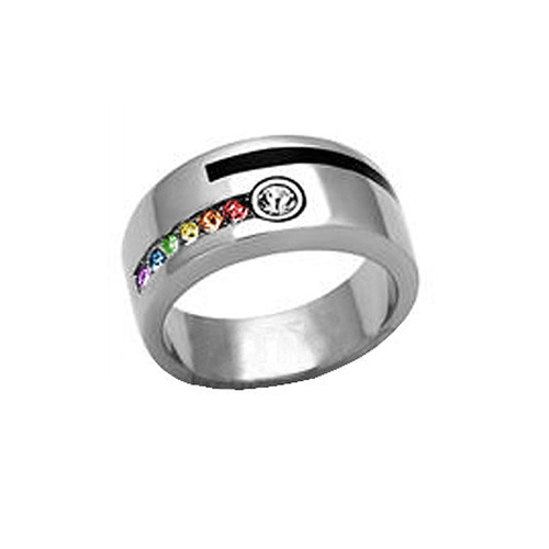 Men's GLBT stainless steel Gay Pride ring with black stripe, clear middle cubic zirconia stone, and rainbow CZ stones! Approx 8mm thick! (Great as Gay Wedding Ring, Promise Ring or Gay Marriage Engagement ring band!) The unique design is comfortable and very fashionable. Available in many sizes (Approx 8mm wide).