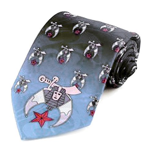 One Shriners necktie has a pattern of small Shriner emblems on a black background that shades to gray near the bottom. A large emblem, known as the crescent and scimitar, centers in the bottom of the tie. Made of 100% polyester, the Shriner neckties use a jacquard weave that adds a subtle dressy swirl to the fabric. Choose these wholesale Shriner neckties for members shopping with you that want to display pride in their fraternity. This novelty tie has a standard length of approximately 58" inches and about 3" in width. Great gift / masonic lodge regalia