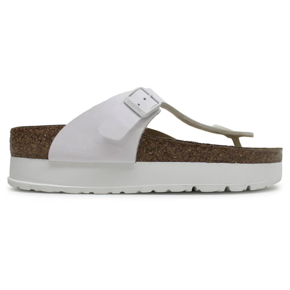 The Gizeh PAP Flex Platform Birko-Flor Unisex Toe Post Sandals combine style and comfort, making them ideal for all-day wear. Part of the Papillio collection, these sandals are designed to promote foot health and maintain a natural walking posture. The durable Birko-Flor synthetic upper has a leather-like finish, while the soft microfiber lining on the underside ensures a comfortable fit. The contoured cork footbed conforms to the shape of your foot, offering personalized support. An adjustable strap with metal buckles provides a flexible fit, and the lightweight.