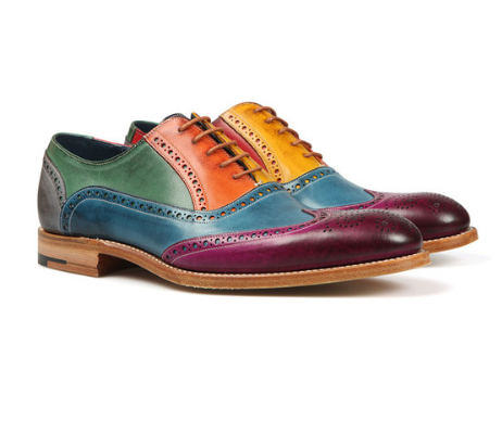 Men's Multi-colored Valiant Hand Painted Shoe by Barker. Crafted from premium unfinished crust leather, each pair is meticulously hand-painted using natural dyes to achieve a luxurious and unique patina. This attention to detail ensures that every shoe boasts its own distinct shade and finish. The Valiant Shoe features classic brogue and wingtip detailing, along with a Goodyear welt construction for durability. Finished with a lace fastening, these shoes marry artisanal craftsmanship with timeless style.