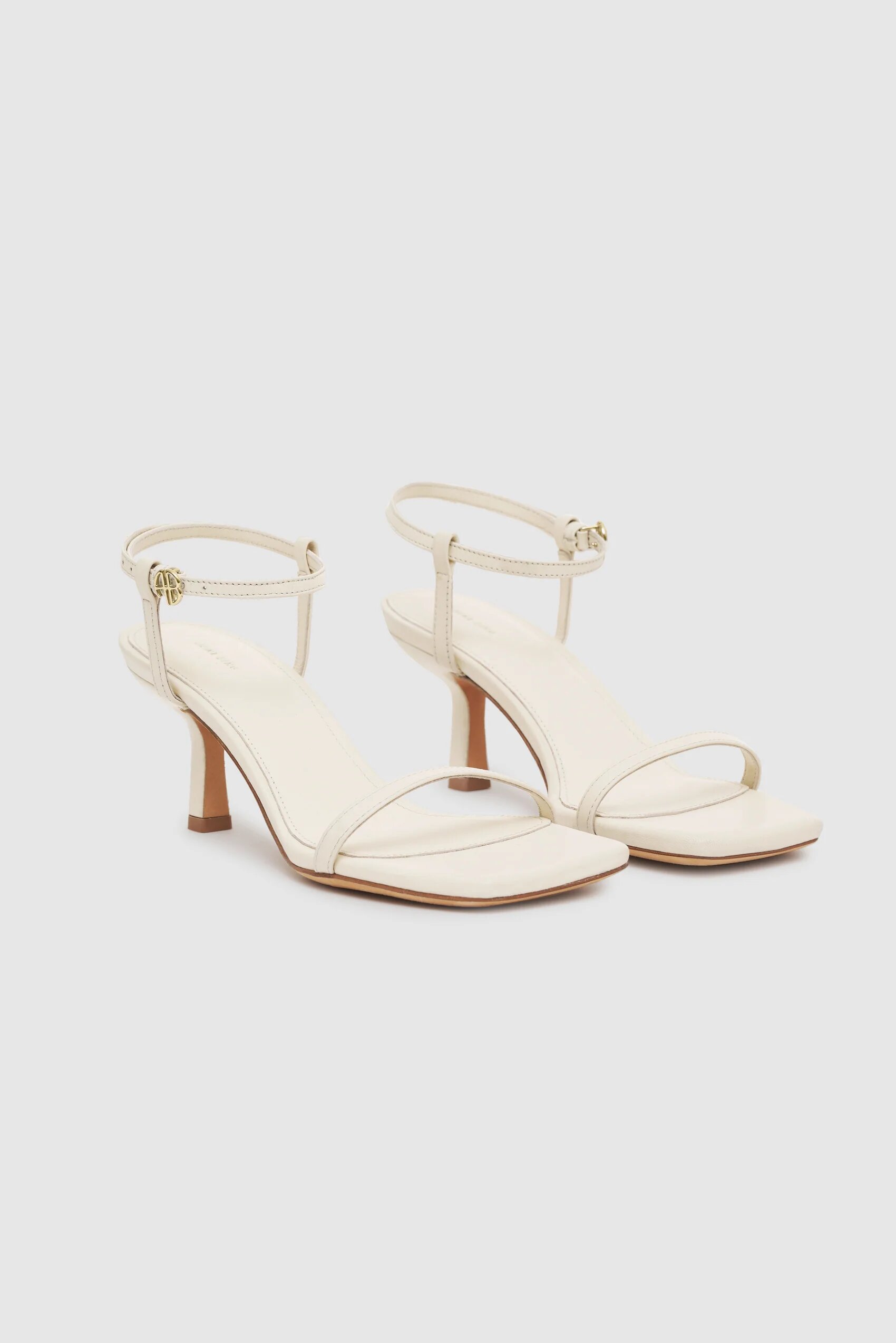 Elegant Invisible Sandals in Cream, available for $360 with complimentary shipping. Crafted from smooth 100% leather, these sandals offer both style and comfort, thanks to their cushioned insole. Their versatile design seamlessly transitions from day to night, boasting a modern square toe and a mid-heel for added sophistication. Accentuated with a gleaming ANINE BING monogram buckle in gold-tone hardware, these sandals are a testament to timeless elegance and attention to detail. Elevate your footwear collection with this chic and versatile pair that effortlessly complements any ensemble.