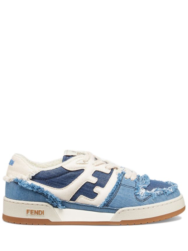 The Fendi Match Sneakers, are priced at $793 with complimentary shipping included. These sneakers feature a classic lace-up design and are crafted from denim in two elegant shades of blue, complete with stylish fringed edges. Adorning the sneakers is a striking white denim FF appliqué, adding a touch of luxury to the design. The rubber sole proudly displays the Fendi lettering on the side, ensuring both style and functionality. Crafted with a blend of 66% cotton and 34% polyester, these sneakers are expertly made in Italy, promising quality and sophistication.