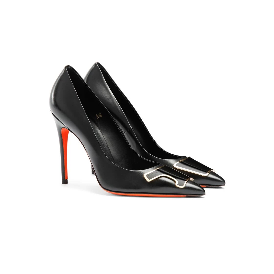 The women's black leather high-heel Santoni Sibille pump, priced at $1130, offers a sophisticated twist on the classic Sibille design. This elegant pump features a soft leather construction that comfortably embraces the foot. It is adorned with an enamelled plaque with gold metal trim, reflecting Santoni's distinctive style codes. The black pump boasts a tapered toe and a tonal double-buckle-inspired detail, complemented by a 10.5 cm stiletto heel, making it a perfect blend of timeless elegance and glamorous details.