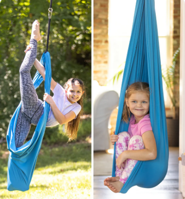 The versatile Stretchy Sensory Yoga Swing is an instant calming and active space in one! Constructed of soft polyester and stretchy spandex materials, this 5¼'L x 5'W durable swing can be used indoors or out (please store indoors), and hold up to 125 lbs. Just hang it from a weight-bearing hook (professional assistance suggested) or our Sky Dome Arched Swing Stand (sold separately), and watch as kids increase flexibility, core strength, balance and overall movement while relieving stress and tension. Or allow them to have a little personal time in their own private get-away. This individual swing also offers a great calming sensation to children with sensory processing disorders.