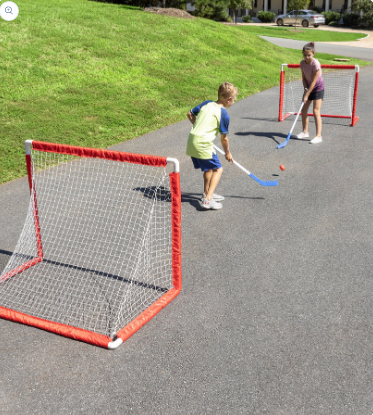 This versatile, instant hockey game can be played on any hard surface indoors or out—set it up in a hallway or basement, or turn your driveway into a hockey arena and invite friends and family for a competitive showdown. Plus, the lightweight goals are easy to assemble and break down, which makes it a perfectly portable game for vacation, family get-togethers, or birthday parties!