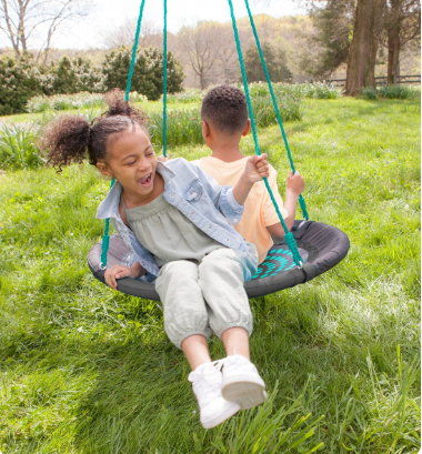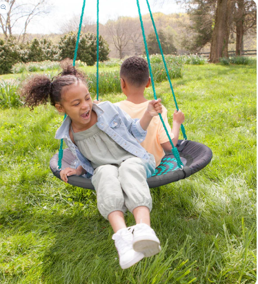 Have you ever seen a swing this ginormous?! With a 46" diam. base, the Mega FunShine Swing is our original FunShine Swing's larger cousin. A durable 24" diam. soft nylon seat is supported by strong and stretchy bright bungee ropes inside a sturdy steel frame padded with foam. Kids will enjoy hours of comfortable swinging, playing, and daydreaming—and because it's so large, it easily seats two kids, or a child and an adult (up to 300 lbs. total weight).