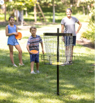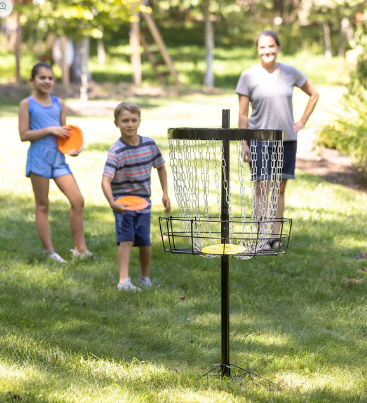 No expensive club memberships necessary for this game—just set up the 52"H golf basket in your backyard or park, establish a tee area by marking off a line, and both beginners and aficionados are ready to play! The 6 colored discs include 2 of each type: orange driver (for the longest throws), yellow mid-range and white putter (for short throws).